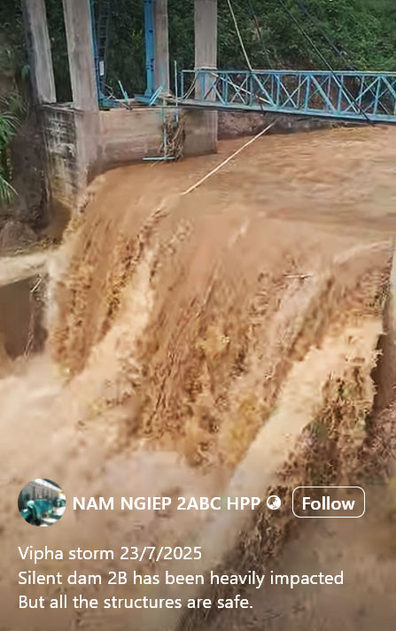 September 29, 2025 during typhoon Buoalai we have reports of a "Dam Failure" at Nam Ngiep 2B with comment of "big loss" but few details. See Facebook link 1 & Facebook link 2 . On one video we can see the dam structure with all 4 release gates closed and water rushing around one end of the structure which seems to be some sort of a washout. Apparently no injuries or casualties but some roads (Road 1D?) were closed temporarily.