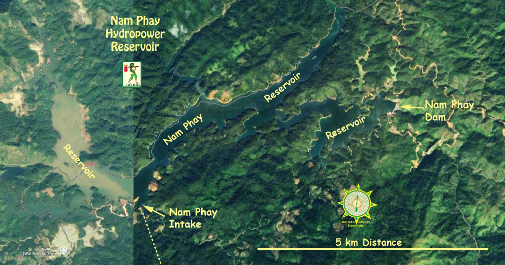 Nam Phay hydropower project layout image below. The powerhouse is about 6.5 km south of the reservoir intake structure and we are assuming there must be an underground conduit connecting them although we haven't seen any info confirming this. The powerhouse has been confirmed as being on the right bank of the Nam Leuk (Louk) river south of the reservoir.