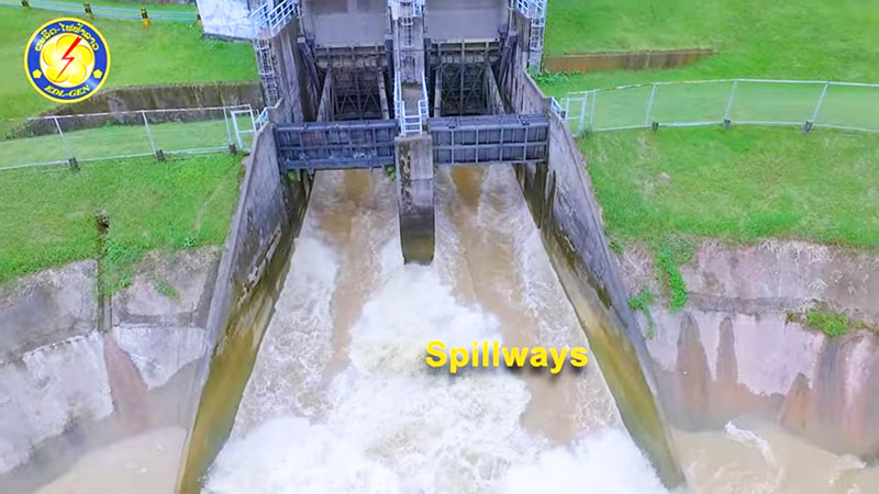 Nam Song Dam weir image below. A minimum flow of 2 cubic meters per second is continuously allowed to spill over the weir dam so the original Nam Song river channel always has a flow downstream of the weir.