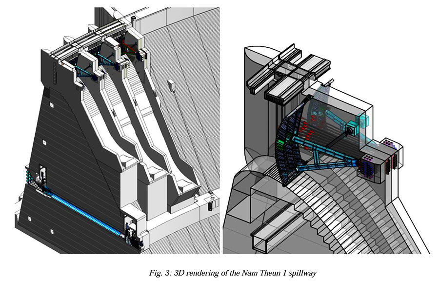 The Nam Theun 1 main spillway has six radial gates 20.3 meters wide by 17.3 meters high with ski-jump style landings into a plunge pool. These may have been the largest radial gates installed in Laos at the time. Radial gates & spillway design image below.