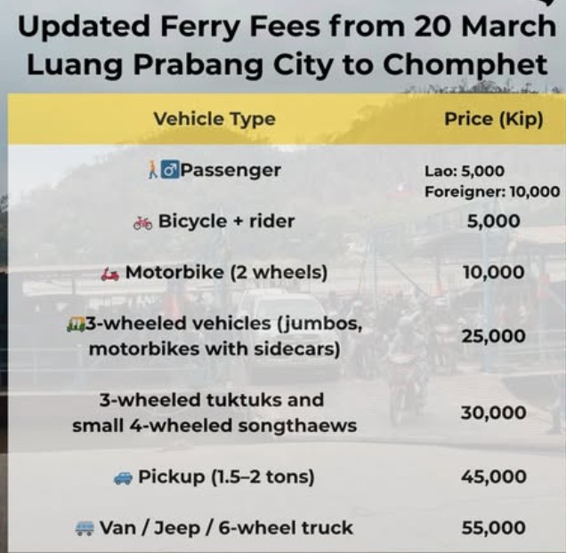 Cross River Ferry Service - there are frequent boats crossing the Mekong back and forth between Luang Prabang central area and Chomphet District. Small passenger boats go every few minutes but these small boats are hard to get in and out of so we recommend foreigners take the larger vehicle ferries instead as the price is the same, access is much easier and there are chairs to sit on. The vehicle ferries also take bicycles and motorbikes.