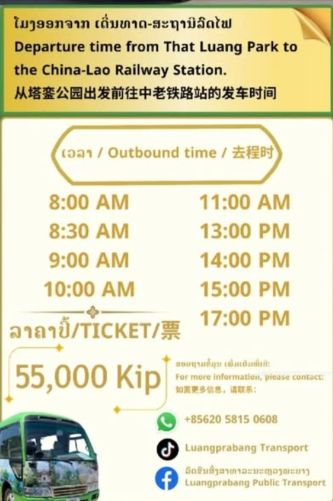 Chart below shows railway ticket fares for trains departing from Luang Prabang. Excludes agency fees and extra 20,000 kip charge for tickets bought with App or not at railway station.